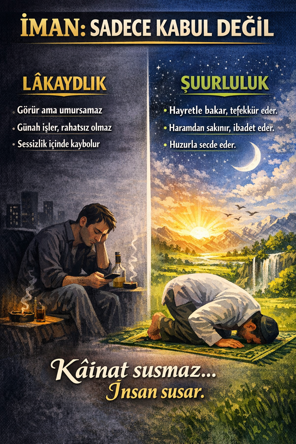 Netice: İman, kâinatın şahitliğini kabul edip Allah’a yönelmektir. Ama onun gerçekliği, günah karşısındaki vicdanınla ölçülür. İnkâr etmek zor, görmezden gelmek kolaydır. İman dilde değil, günah anındaki kalpte belli olur. Günah değil, günaha alışmak öldürür. Kalp rahatsız olmuyorsa, tehlike başlamıştır. İman varsa iç savaş vardır; yoksa sessizlik.