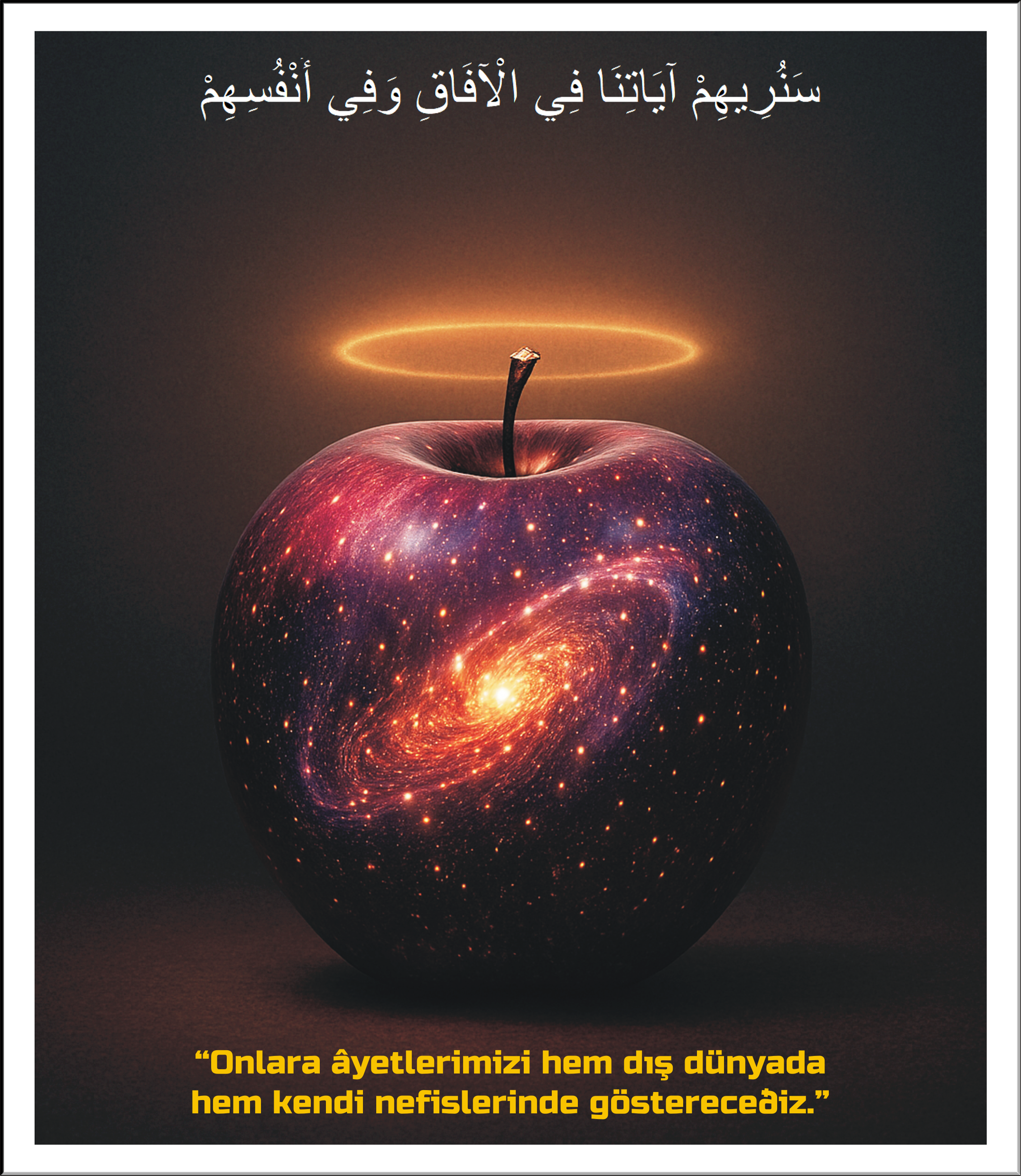 Bir elma bütün kâinatla bağlantılı… Elmanın oluşması için: Güneş doğru mesafede olacak; dünya doğru hızla dönecek; mevsimler düzenli işleyecek; toprakta hassas mineraller bulunacak. Yani elma, küçük ama arkasında bütün kâinat var. Bu da gösteriyor ki işi yapan güç parçalı değil; tek merkezden idare ediliyor. Burada Vâhid ismi okunuyor.