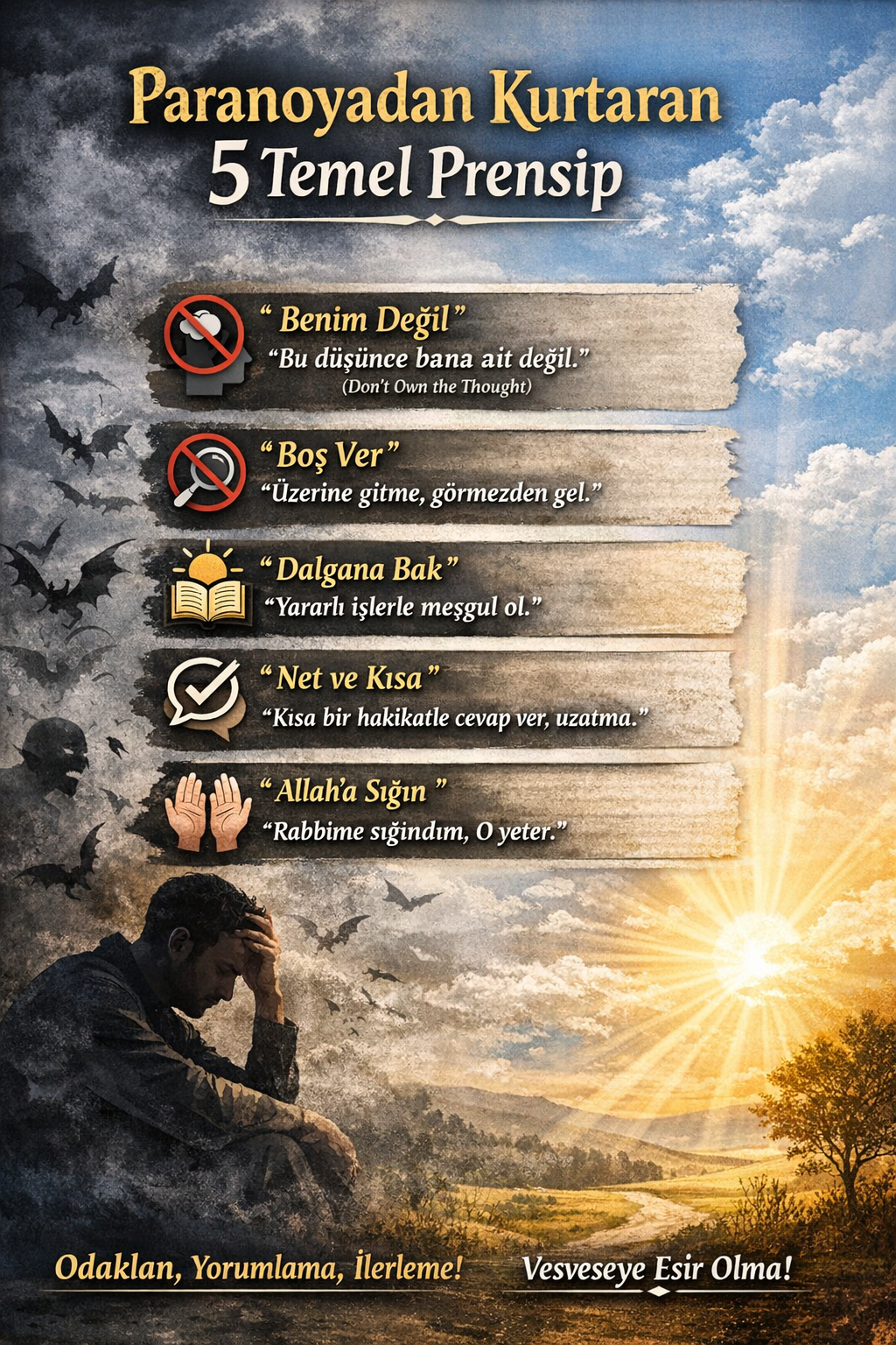 “Bu Ben Değilim” kalkanını otomatikleştir: Telefonuna alarm kur, her gün 3 kez “Bu düşünce bana ait değil” de. 21 günde alışkanlık olur.